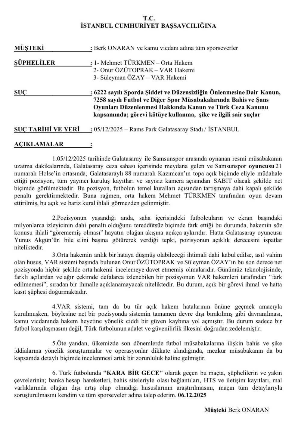 Avukat Berk Onaran, sosyal medya hesabı üzerinden yaptığı açıklamayla, Samsunspor ile Galatasaray arasında oynanan karşılaşmada görev alan orta hakem ve VAR hakemi hakkında İstanbul Cumhuriyet Başsavcılığı'na suç duyurusunda bulunduğunu duyurdu.